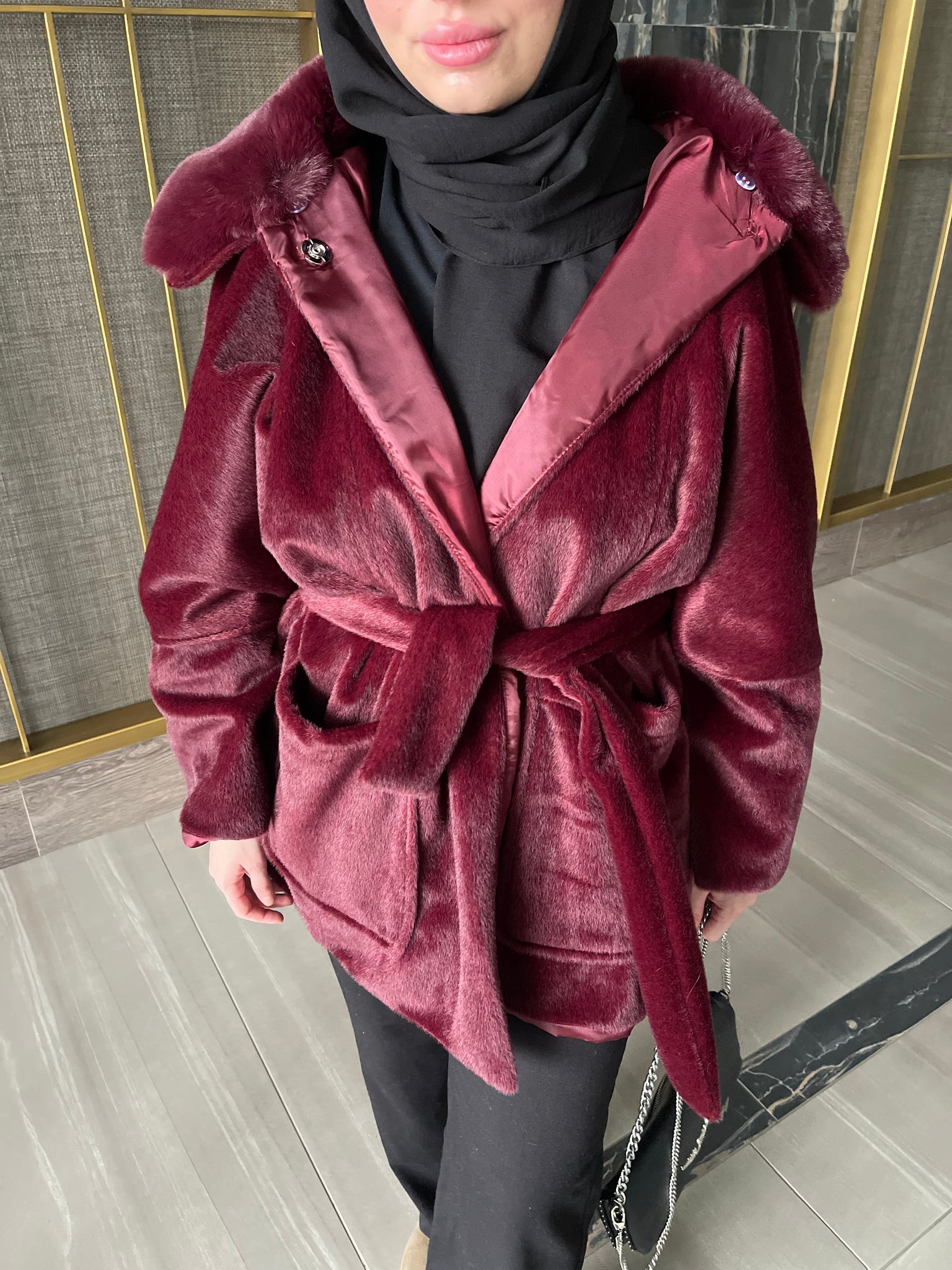 Ürün boy 80 cm Seyyar kemeri mevcut Yaka kürkü çıkarılabilir Touch kaşe kumaştır Önü düğmesiz ve...